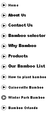 At our Winter park area bamboo nursery you will find the one stop solution for all of your bamboo needs. We are a Winter park area specialty bamboo nursery that offers many beautiful clumping bamboo varieties wholesale to the public. Our bamboo is beautiful and tropical and can be used in many different applications and for many different uses. All of our bamboos are clumping bamboo. Clumping bamboos can also be referred to as a non intrusive bamboo because the clumping bamboo stays in a contained clump opposed to the running bamboos which can travel and spread in great distance. Clumping bamboos make great natural fences, shrub lines, ornamental landscaping, privacy barriers, shade, wind barriers, and screening from noxious uses. Clumping bamboo in Winter Park is also used as a natural resource. with its long fibers it is as strong as mild steel and is used for building, ropes, cooking and eating utensils, roof tiles, baskets, furniture, lamps, lamp shades, musical instruments, garden stakes, flooring and the young shoots of many bamboo verities can even be eaten. Come visit our 5 acre bamboo farm located in beautiful Ocoee Florida. We offer 3 gallon, 7 gallon, 15 gallon, 45 gallon and field dug clumps of clumping bamboo. Call our Winter Park area Bamboo nursery 407-777-4807 or CLICK HERE to see our bamboo list |